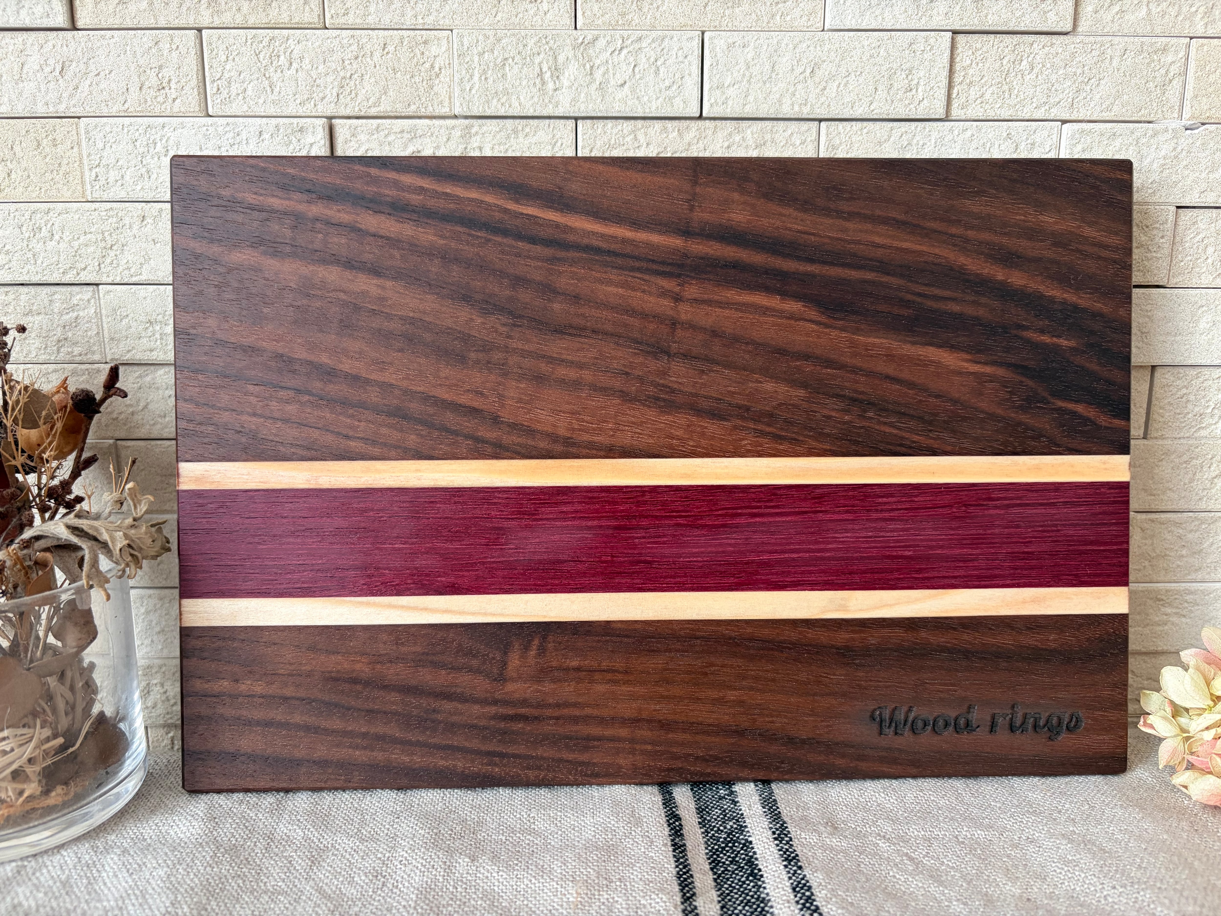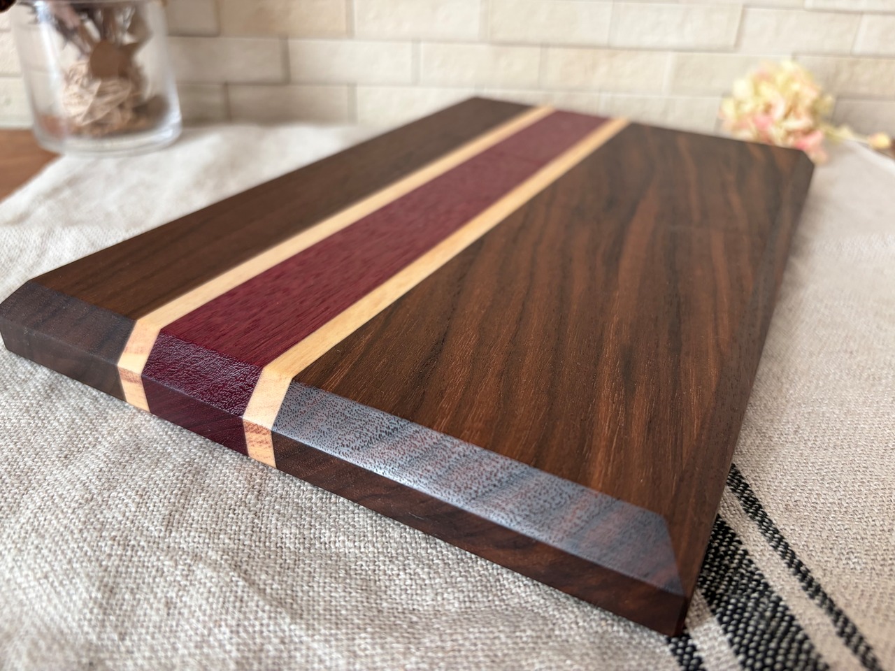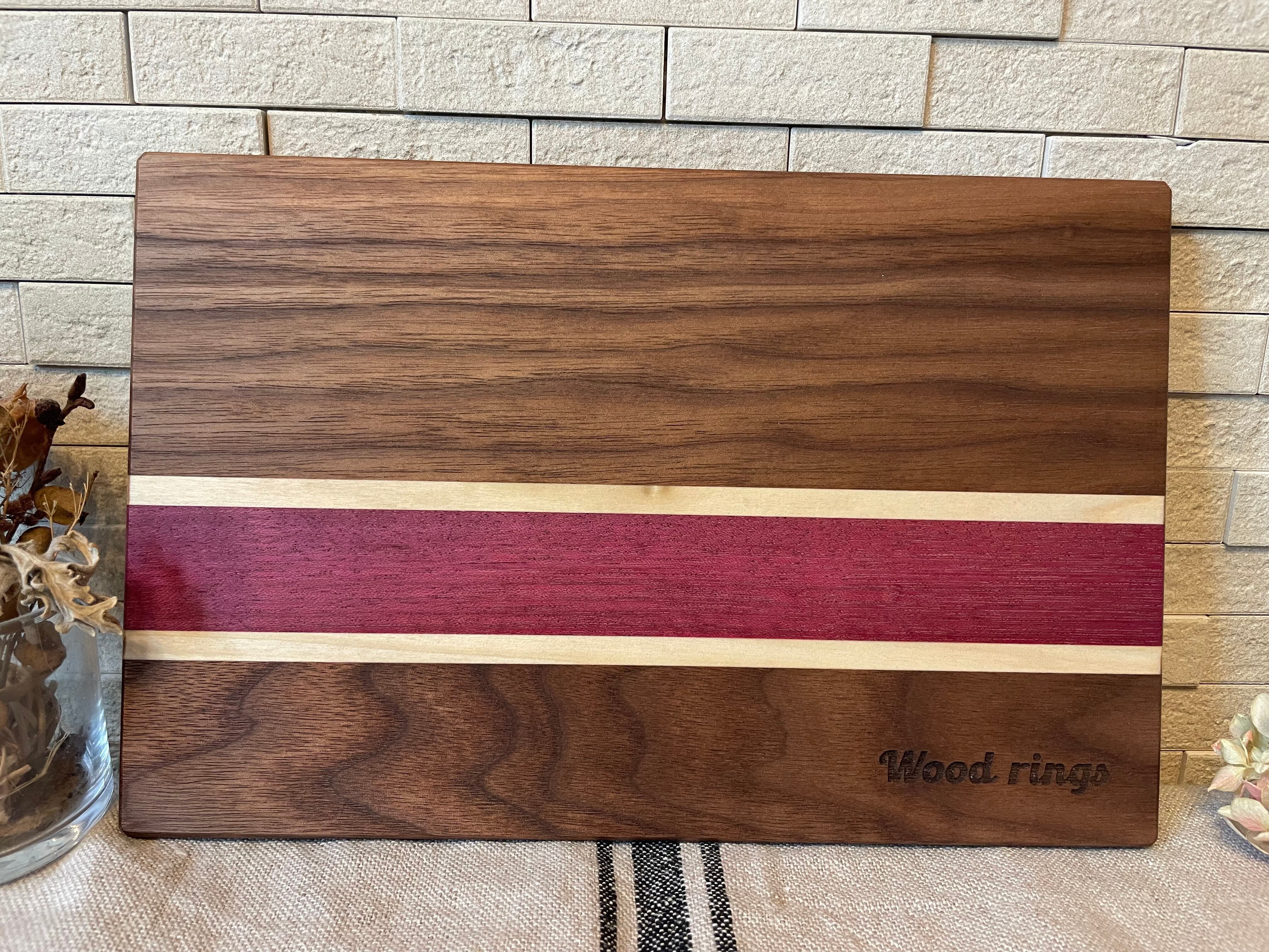 古くから高級家具や楽器の材料に使われている世界三大銘木の内のひとつブラックウォールナットにポプラと名前の通り紫色をした、珍しく個性的なパープルハートを使用したカッティングボードです。