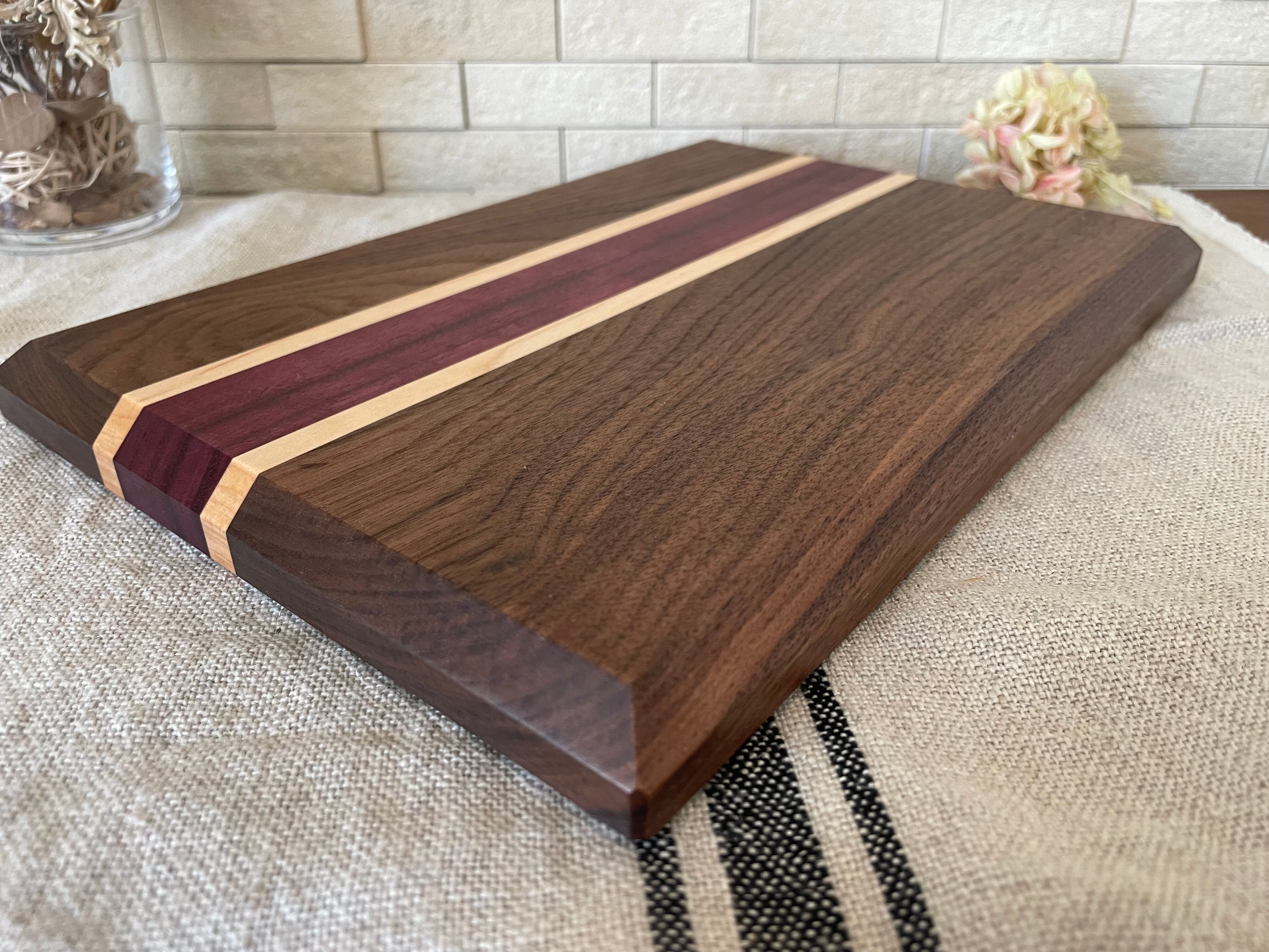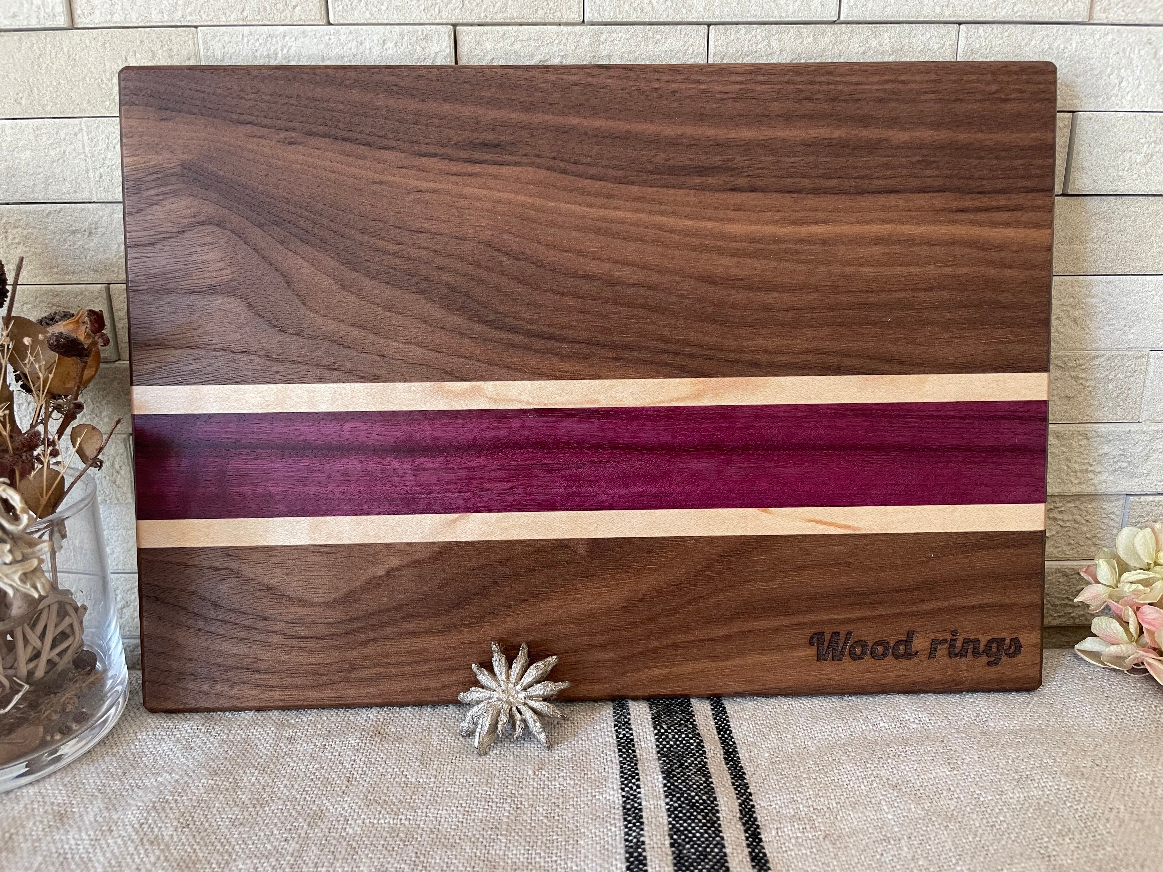 古くから高級家具や楽器の材料に使われている世界三大銘木の内のひとつブラックウォールナットにメープルと名前の通り紫色をした、珍しく個性的なパープルハートを使用したカッティングボードです。