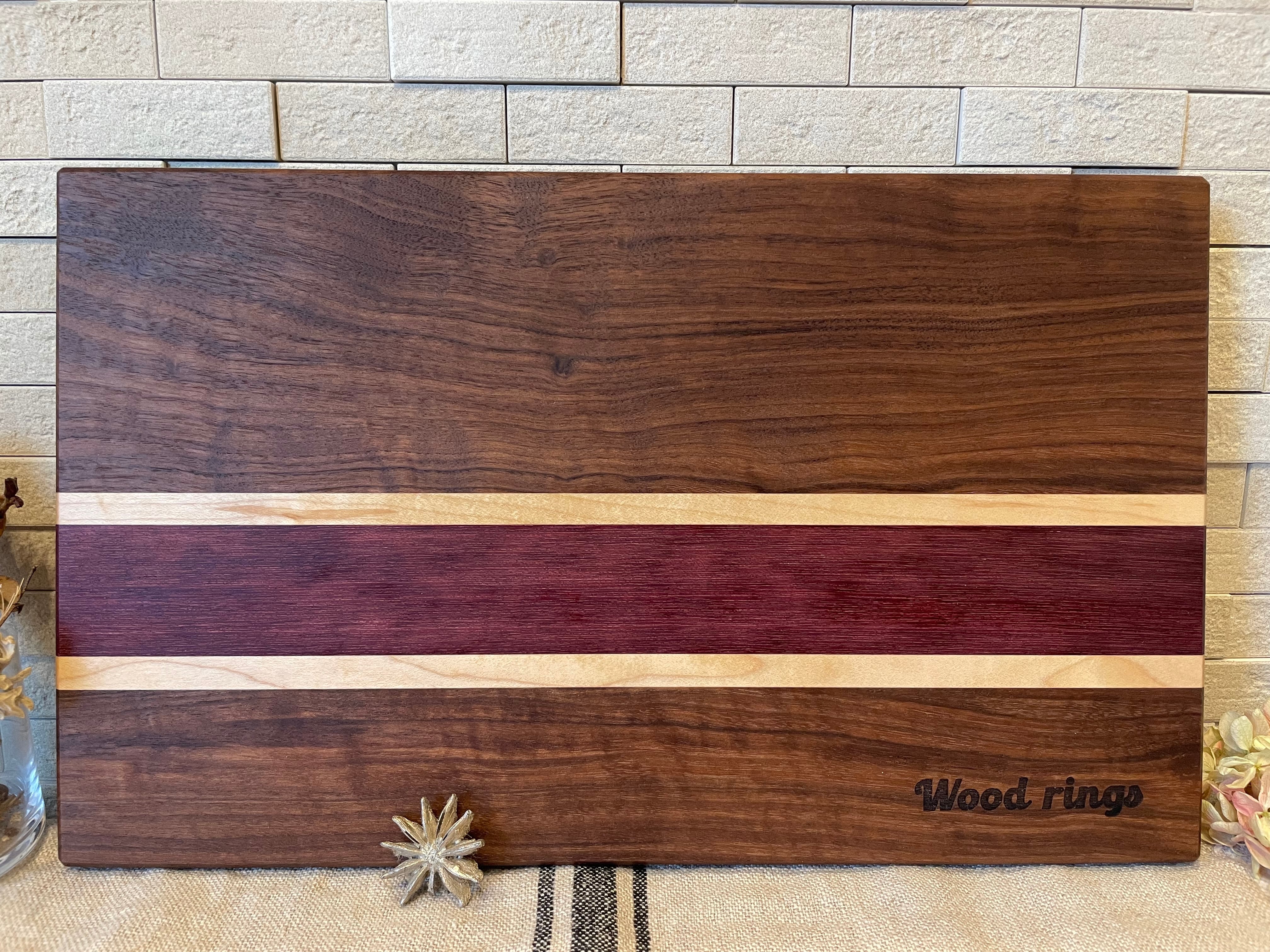 古くから高級家具や楽器の材料に使われている世界三大銘木の内のひとつブラックウォールナットにメープルと名前の通り紫色をした、珍しく個性的なパープルハートを使用したカッティングボードです。