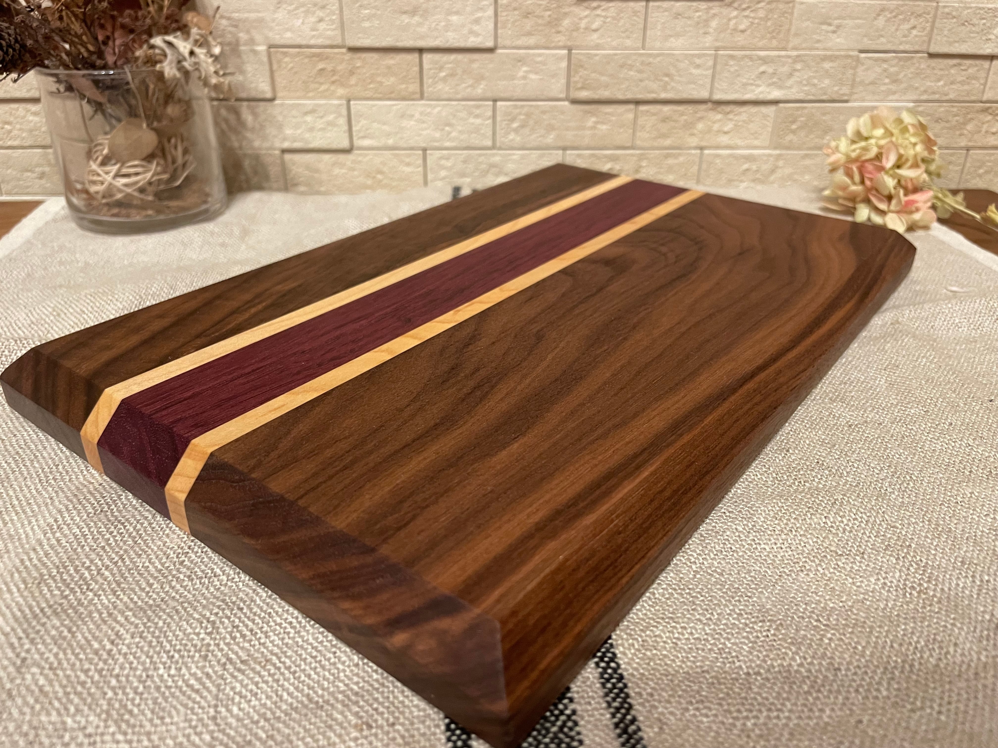 古くから高級家具や楽器の材料に使われている世界三大銘木の内のひとつブラックウォールナットにメープルと名前の通り紫色をした、珍しく個性的なパープルハートを使用したカッティングボードです。