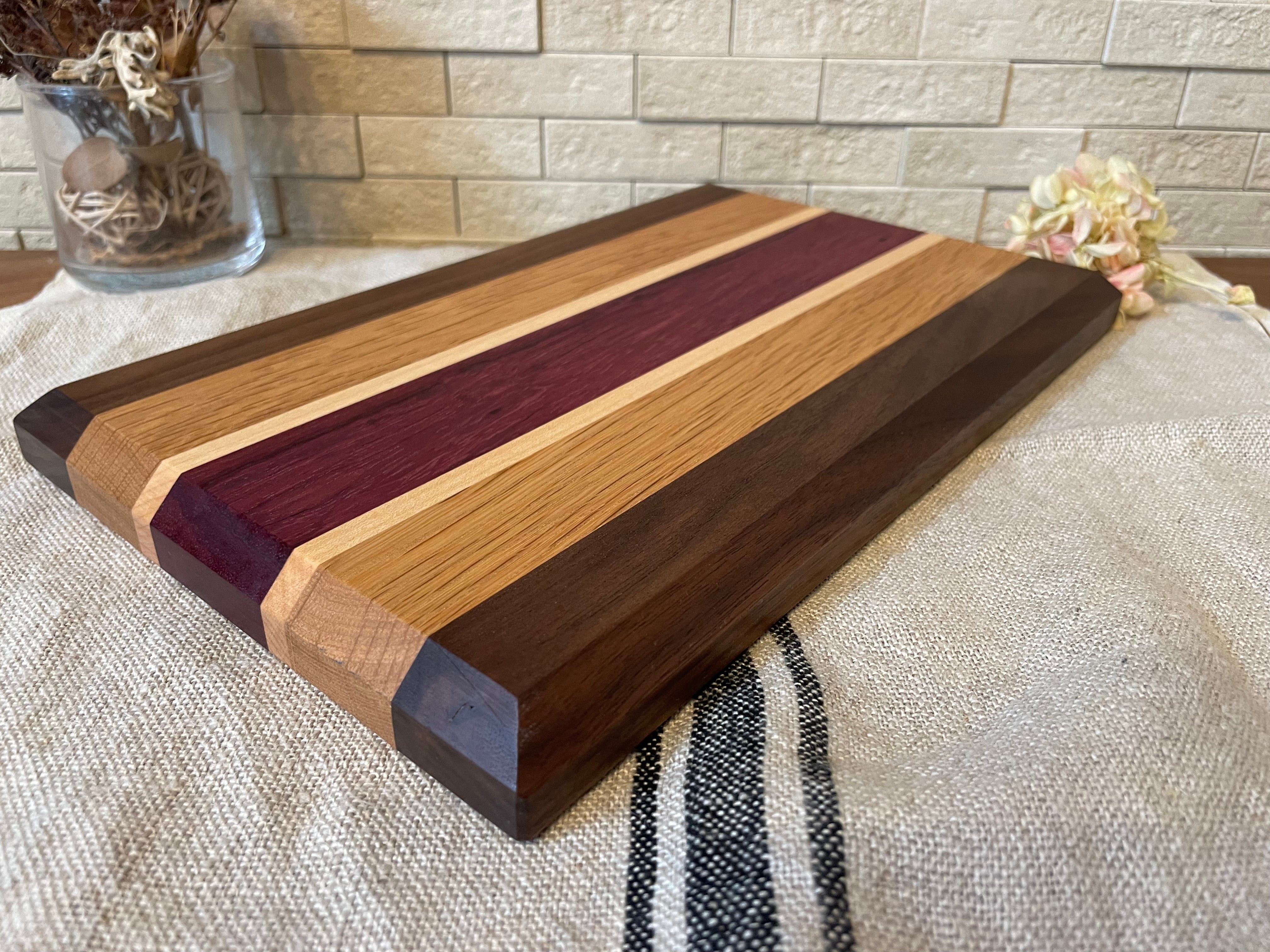 古くから高級家具や楽器の材料に使われている世界三大銘木の内のひとつブラックウォールナットにポプラとオーク、そして名前の通り紫色をした、珍しく個性的なパープルハートを使用したカッティングボードです。