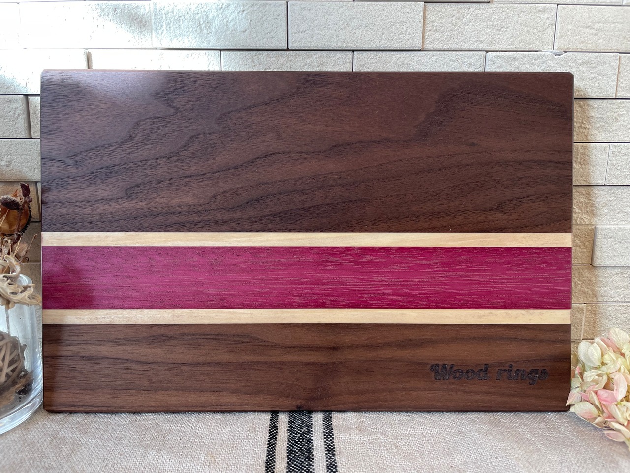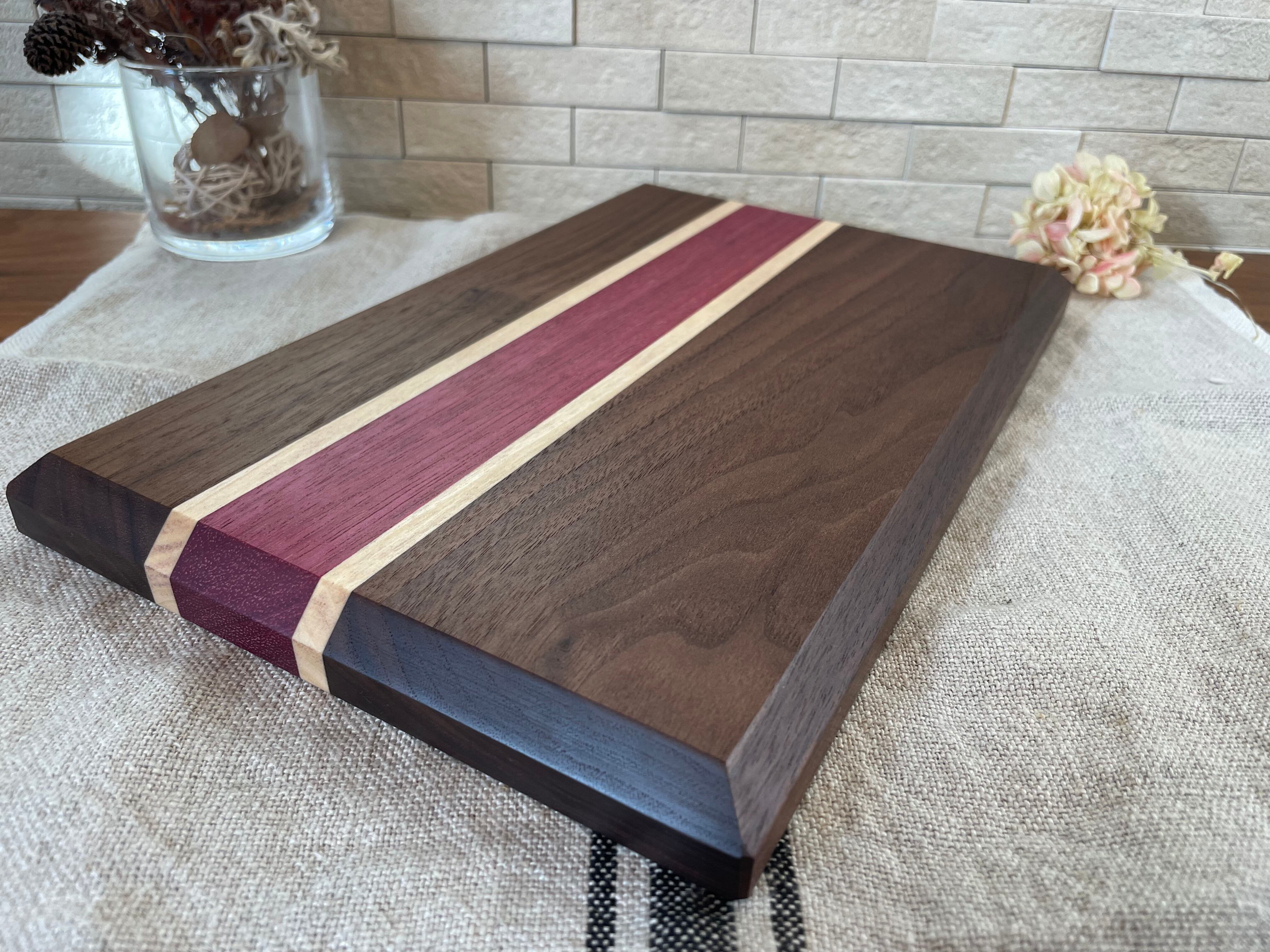 古くから高級家具や楽器の材料に使われている世界三大銘木の内のひとつブラックウォールナットにポプラと名前の通り紫色をした、珍しく個性的なパープルハートを使用したカッティングボードです。